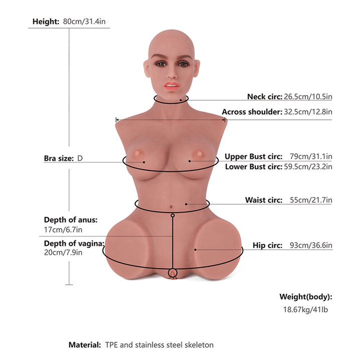 Torso de muñeca sexual realista, hecho completamente de silicona (TPE). Debido al esqueleto de metal, se puede usar en todas las posiciones. Esta hermosa dama es adecuada para un uso prolongado. Esta muñeca sexual está diseñada de tal manera que el sexo con ella se siente como con una mujer real. Use lubricante a base de agua con este producto.